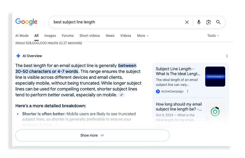 AI Overviews are often the on-ramp to deeper user intent. They show up when someone asks a quick question or searches for a common how-to—queries like “best subject line length” or “how to write a UX case study.” These summaries can be the first impression your brand makes.