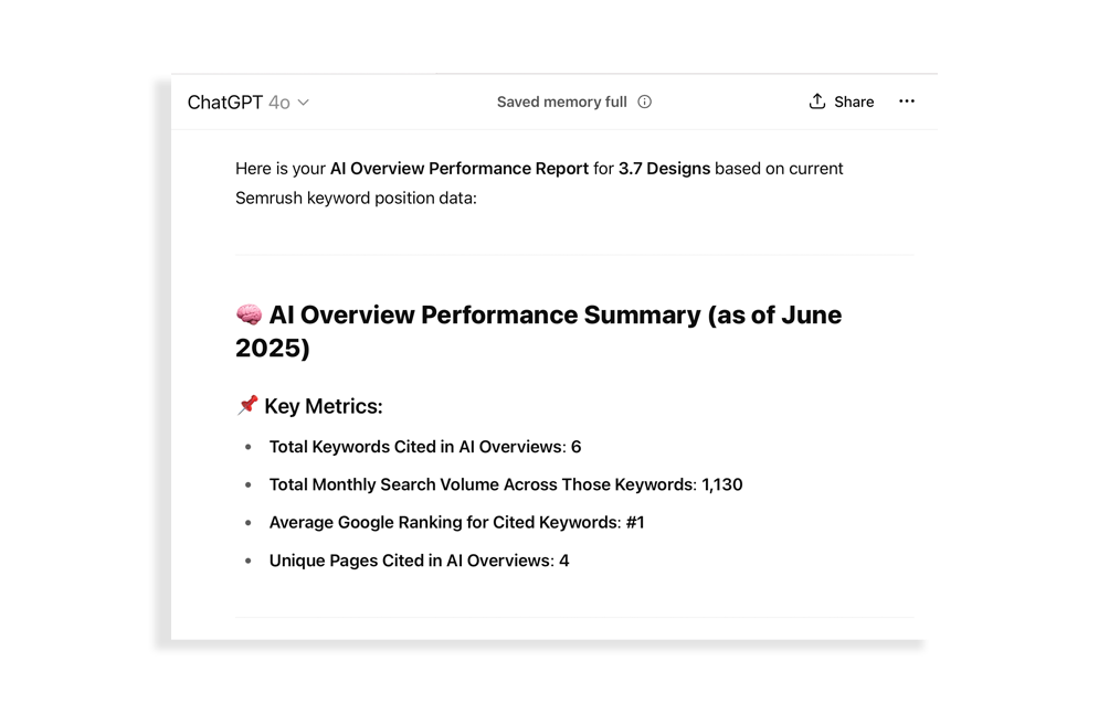 Pro tip: Combine these with your GEO metrics (e.g., ChatGPT recs, Gemini mentions) to build a complete AI Visibility Report.