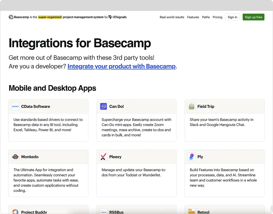 For more examples, look at the Basecamp integration directory. There are dozens of tools that integrate with Basecamp, so when users look for ways to extend their project management platform, they discover new tools and options they might not have found otherwise.