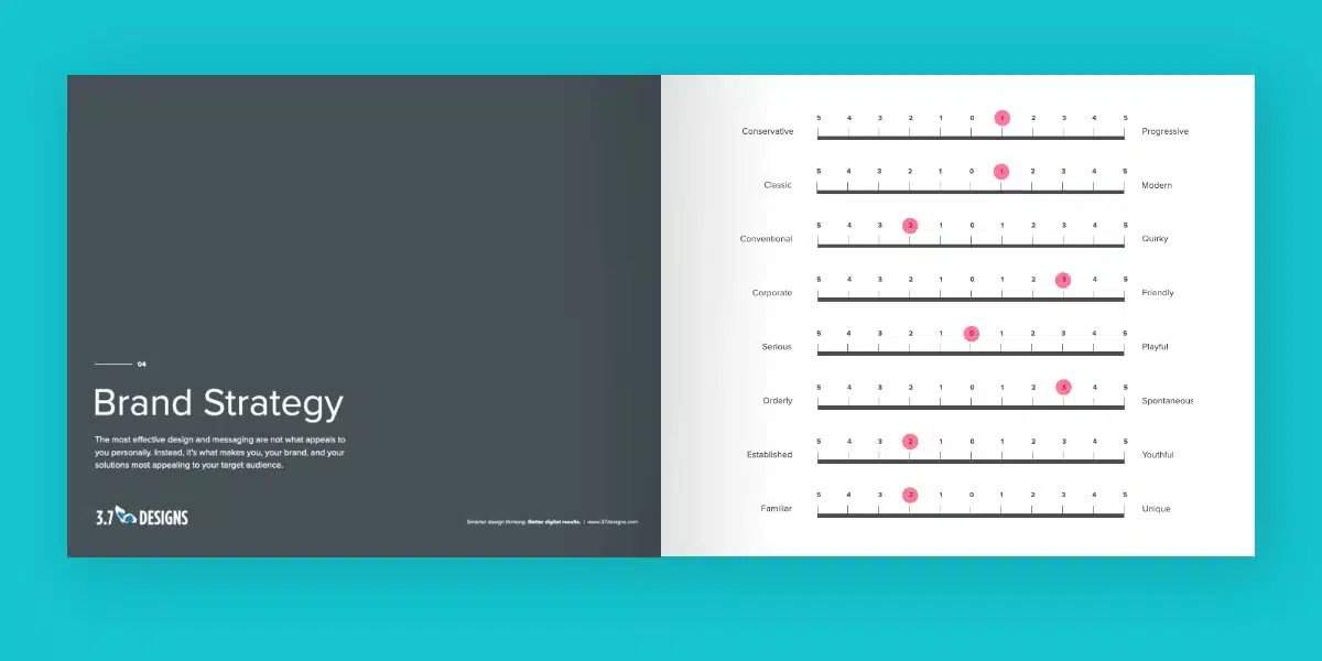 This is the approach we have taken at Three Seven for years, especially when conducting website redesigns for clients. We asked stakeholders to compare near opposites, and while it was effective, we noticed a sticking point–it was too easy to interpret the adjectives as extremes. If we asked, “Should this feel fun or serious?” a typical response would be, “well, we don’t want it to be tax law serious.” So we modified our approach, giving stakeholders a scale so they could indicate 1 – 5 how serious it should be.