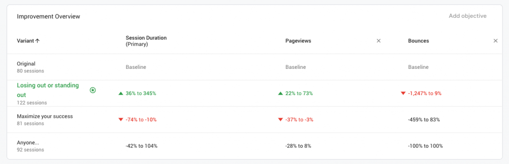 If you’re struggling where to start, test something simple like two versions of the primary message on your homepage. Measure engagement like time on site, average pages per visit, and bounce rate.