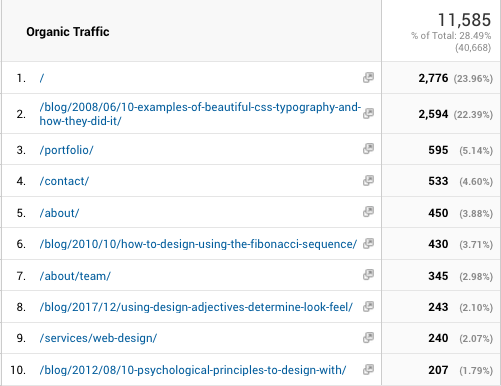 Most websites follow the 80/20 rule when it comes to content performance, 80% of the visits are on 20% of pages. Often times the top visited pages are also the oldest.